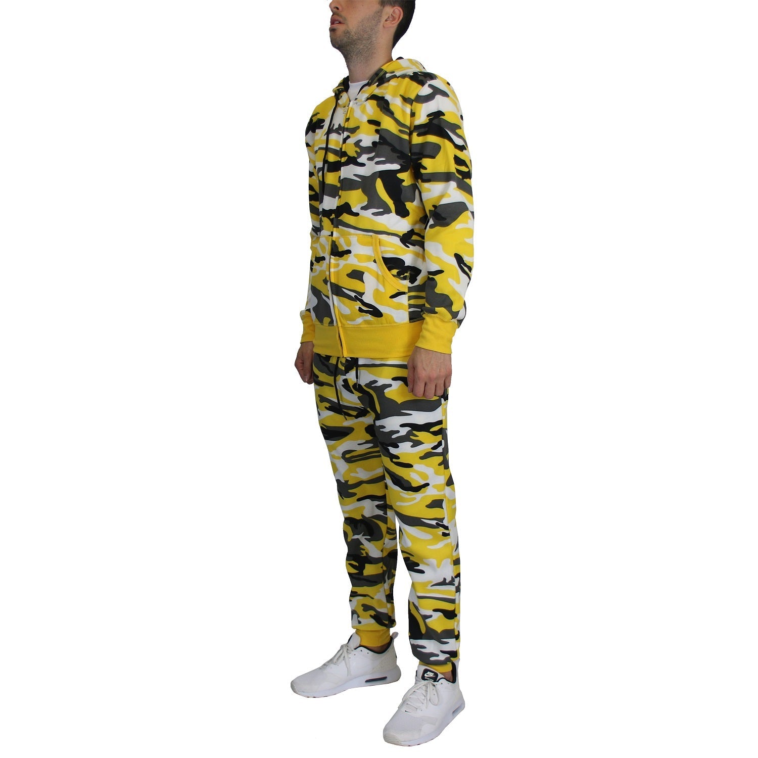 This Wholesale Men's Zip Up Hoodie and Jogger fleece set in Yellow Camo, offers a powerful and fashionable option for those seeking a bold statement piece in their wardrobe. Its combination of quality & design makes it a standout choice for customers looking for style.